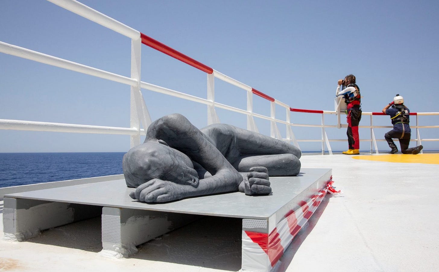 He claims it was to represent a refugee, but this identification does not make much sense. It shows a withered man resembling a corpse. The first display of it was on a ship.