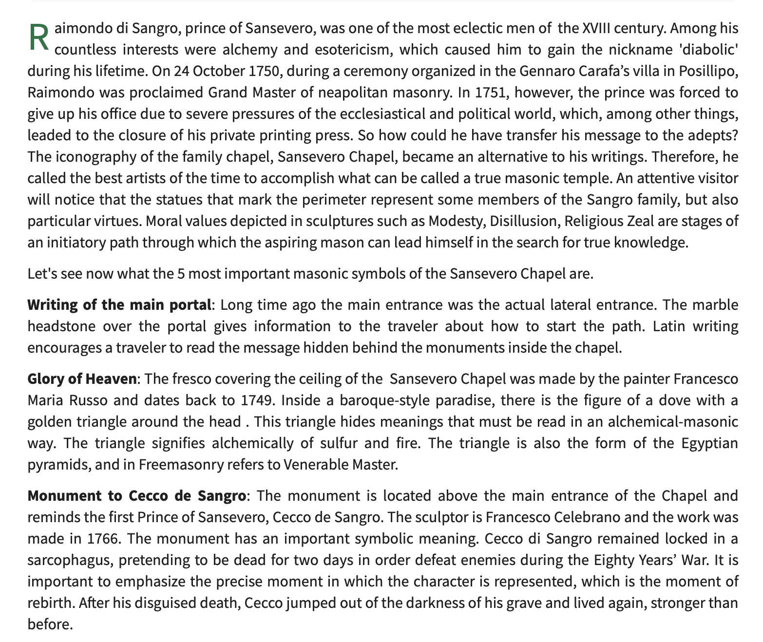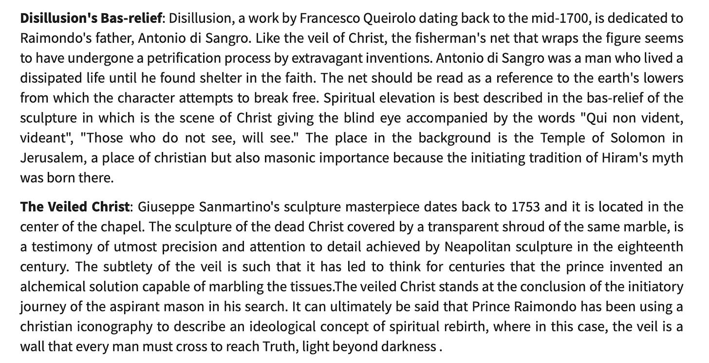 And what is even more fascinating, and damning, is the story behind the original Veiled Christ statue and the church it is in. The Sansevero Chapel. A Chapel explicitly linked to Freemasonry. Probably the most explicitly linked chapel to Freemasonry in the entire world. And this is not some veiled (pardon the pun) conspiracy, this is freely admitted and explained on even the official Naples visitor website. To demonstrate how well known this is, I’ll post an excerpt from the official site on the chapel.