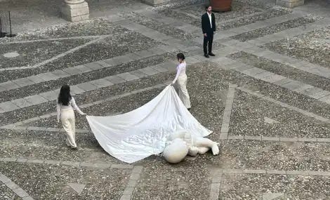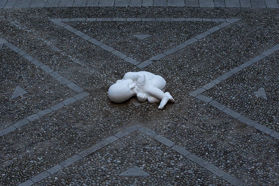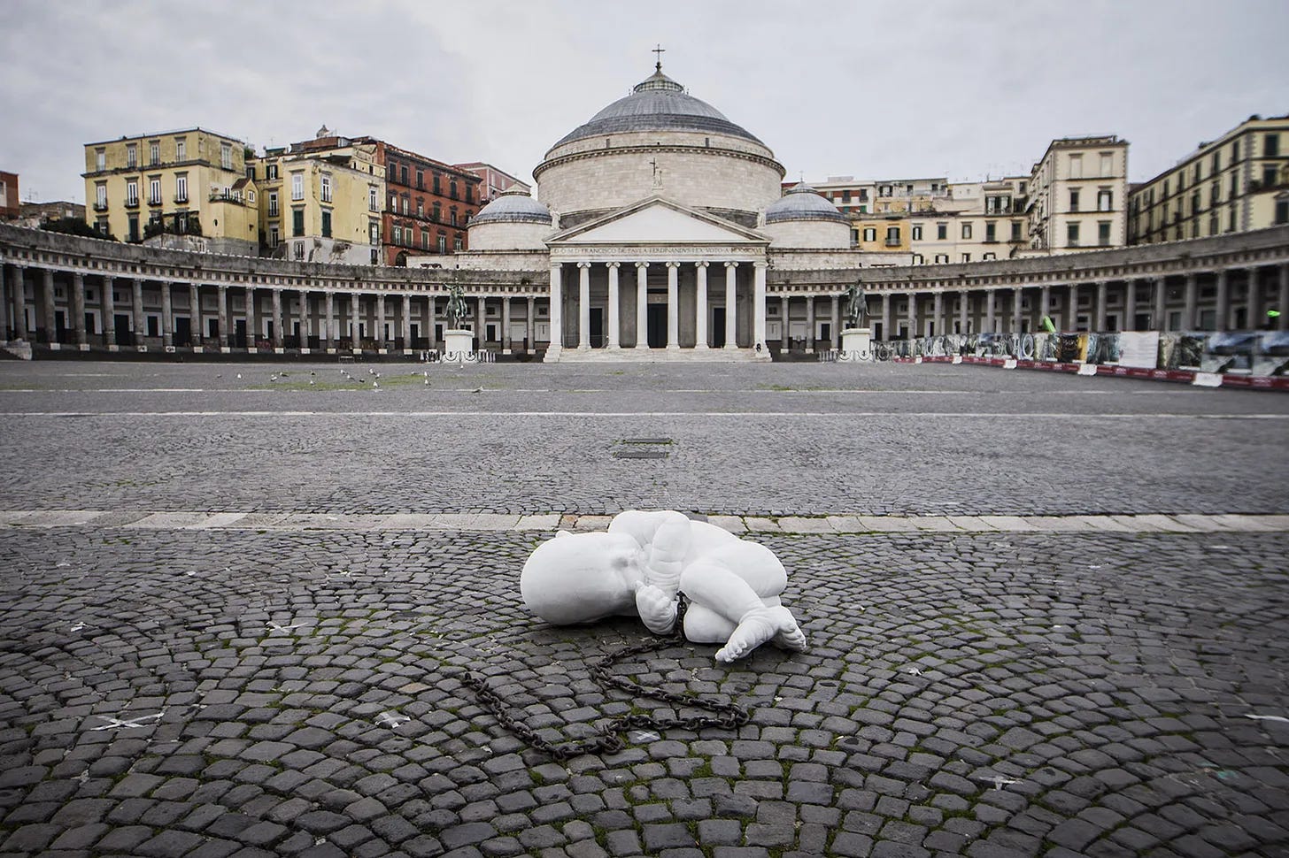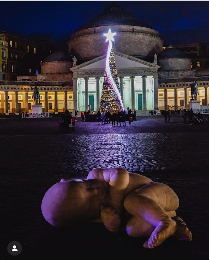 A larger child in the same fetal position, landing in the square of Piazza del Plebiscito, as if he has fallen from the sky, with a chain as an umbilical cord.