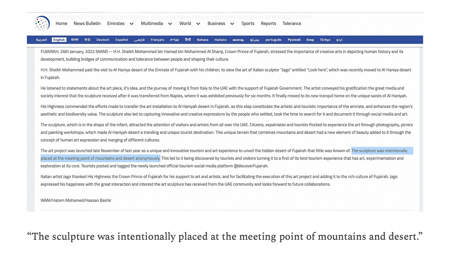 I initially found it odd that Jago and his benefactors picked a location in the UAE for the symbolic Mount Quarantania. Would not an area closer to the levant be more fitting—more biblical— for this specific visual statement?