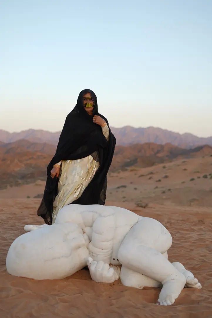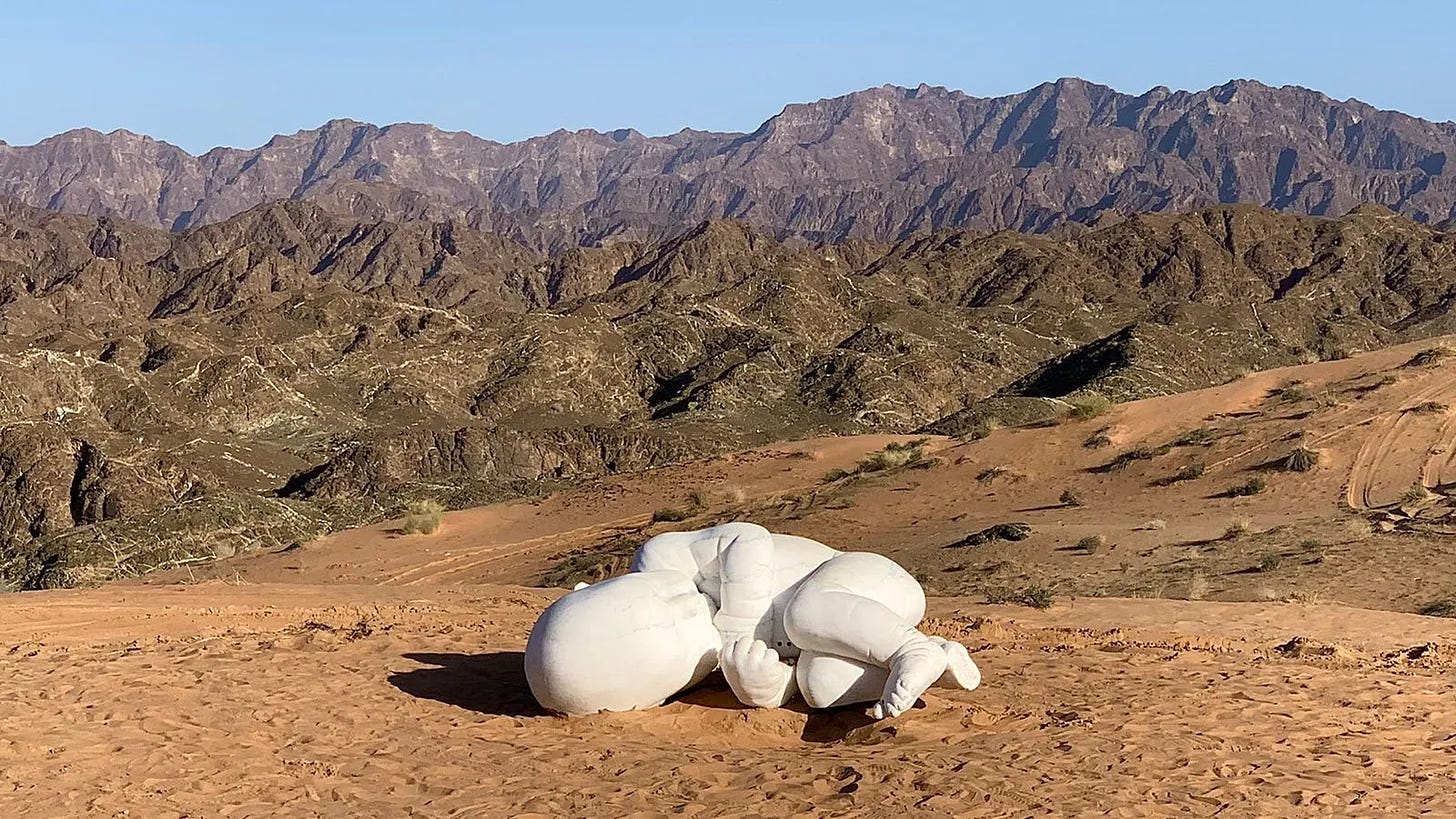 The chain is removed (he is unchained) and the sculpture appears in the Al Haniya desert, for reasons mysterious and unexplained.