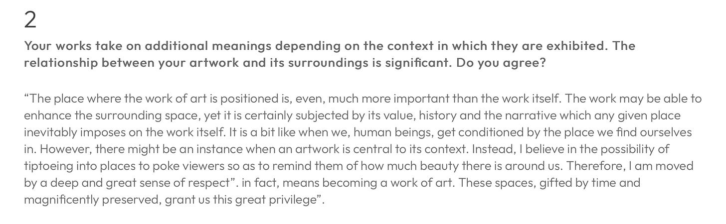 If you think I am going a bit overboard in my analysis of the locations in which Jago chooses to display his work, I will direct you to Jago’s own words.