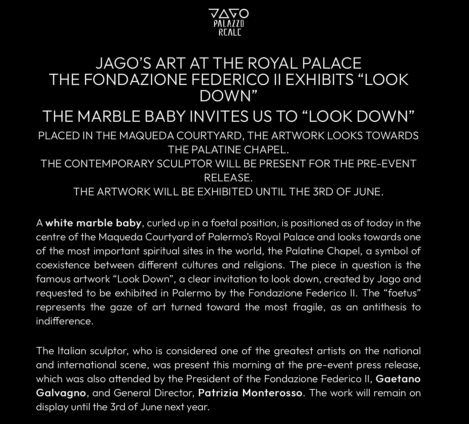 Luca Parmitano’s second space expedition ended on February 6, 2020, and with it, the end of Jago’s sculpture’s trip in space. By some great coincidence, this “child of the future” lands back on earth during the week in which the world would change. For it was one week after that the first cases of Covid were confirmed in Italy. As if on some symbolic level, this work descended to earth as the virus came to Europe. The virus that would herald the future. Later that year, Jago unveils the larger fetus statue in Napoli. It is called Look Down, an intentional play on the term Lockdown, which had chained Italian citizens for the better part of a year. The statue is then mysteriously moved to the desert, specifically placed in a location where the desert and mountains meet, mirroring the location of Christs own temptation.