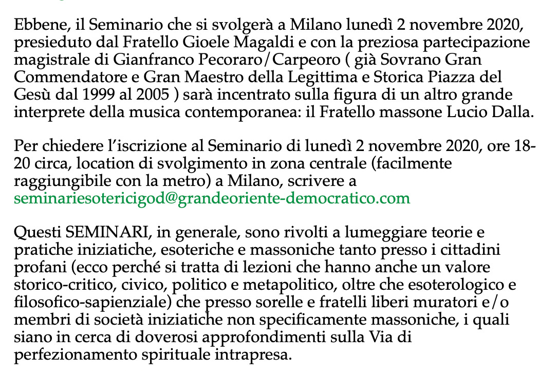 But Lucio Dalla and his aforementioned song ring with significance for Italian Freemasons, at least according to Giovanni Francesco Carpeoro. Carpeoro is a prolific Italian Freemason who was grandmaster of La Legittima e Storica Piazza del Gesù (the masonic lodge of Piazza del Gesu) from 1999 to 2005. He is considered an expert on masonic symbolism and he was personal friends with Lucio Dalla himself. In the past, Carpeoro said that Dalla was “an initiate,” “one of the last Rosicrucians,” and “a brother mason.” And even stranger, Carpeoro gave a closed lecture to fellow freemasons on the masonic significance of Lucio Balla and his song “L’Ultima Luna” two months after Jago posted the video of Parmitano’s comments.